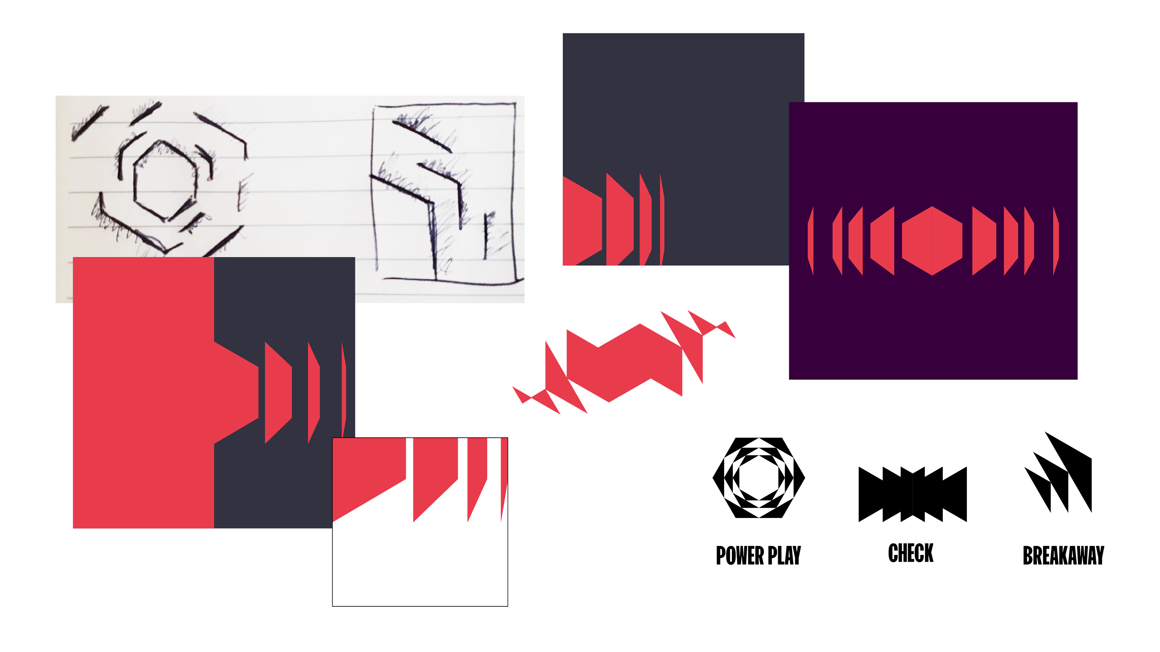 One of the CHL's main objectives of the refresh was for more variety. I aimed to develop a graphic language that would allow for endless possibilities and expressions. The hexagonal CHL badge became the catalyst for graphic language exploration. The badge was a piece of the identity that had gained recognition, was unique within the world of ice hockey, and was to be retained. We explored how to inject simple hexagonal forms with the Hypercharged energy of CHL hockey.