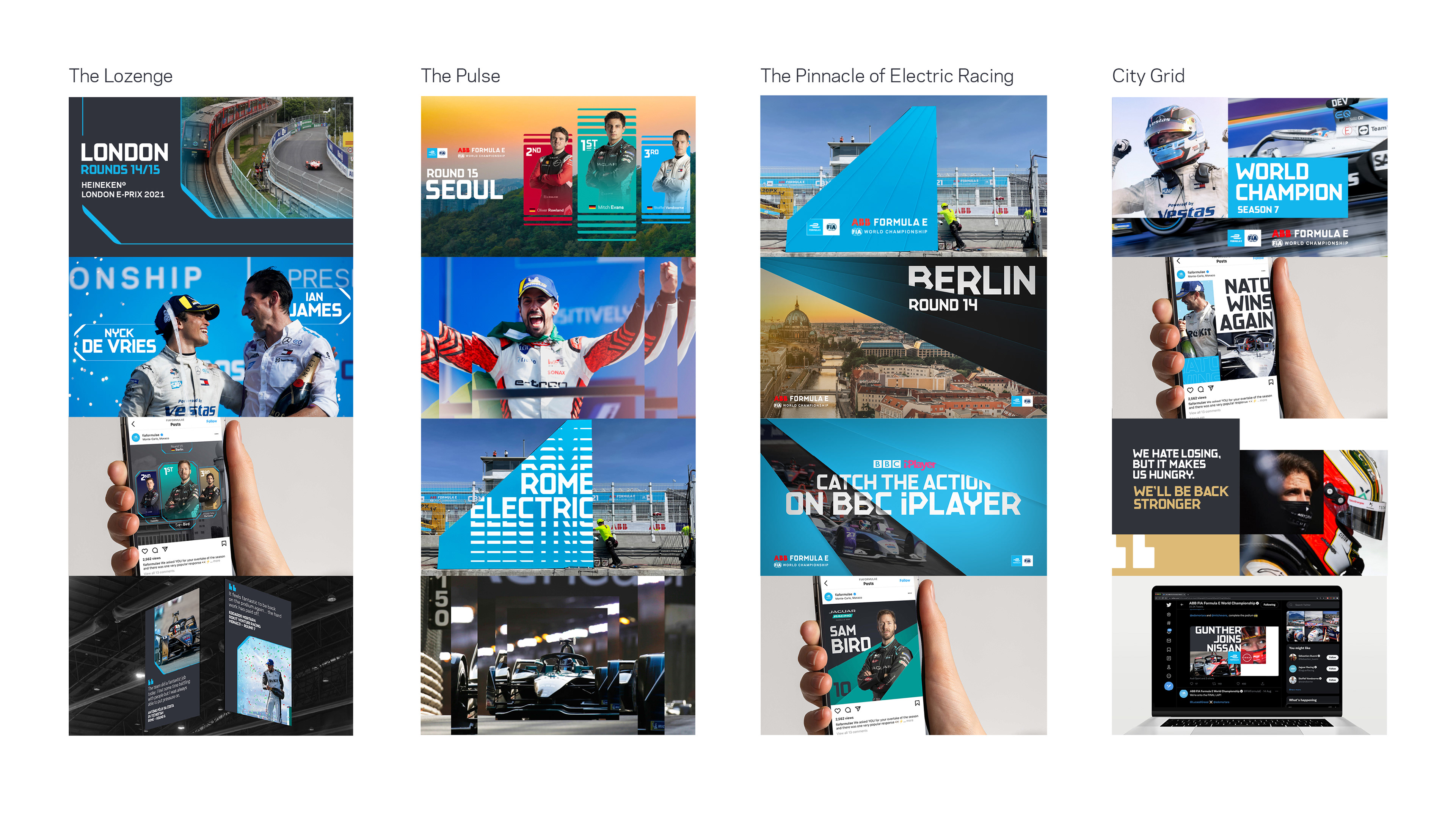 The chosen system entitled 'City Grid' utilised bold rectangular forms with high contrast, embracing the hard lines of the cityscapes in which Formula E races and rediscovering the core principles of the original identity.