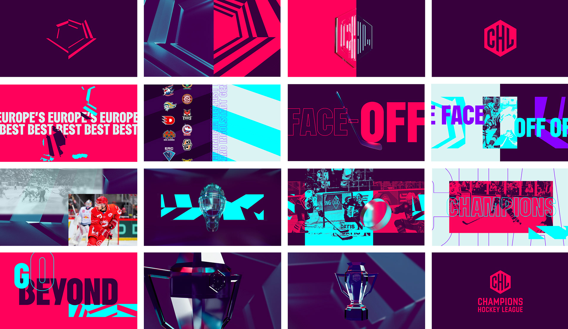 Storyboard for a title sequence as part of a pitch for the Champions Hockey League's broadcast package. I developed my Cinema 4D skills for the pitch, modelling and texturing the CHL trophy and graphic language as well as adding texture and lighting to CG models of ice hockey helmets, pucks and sticks.